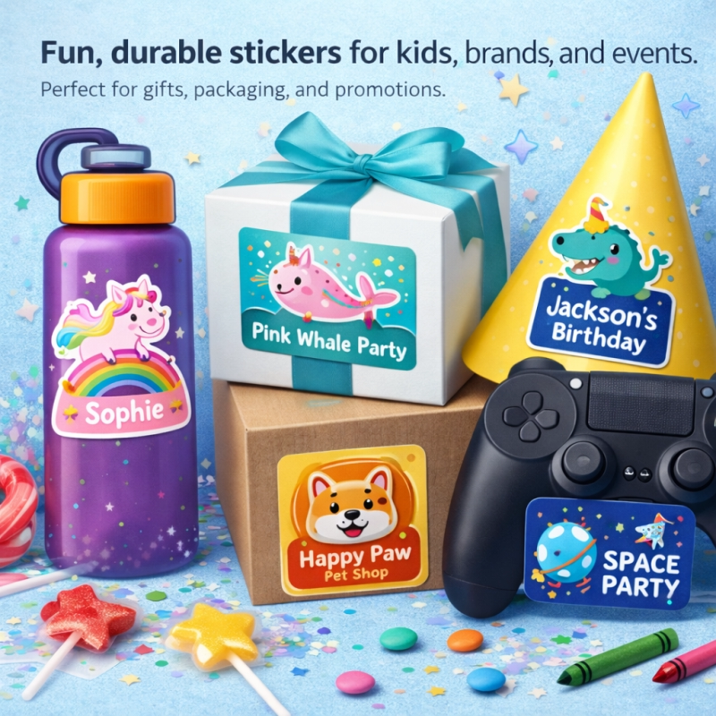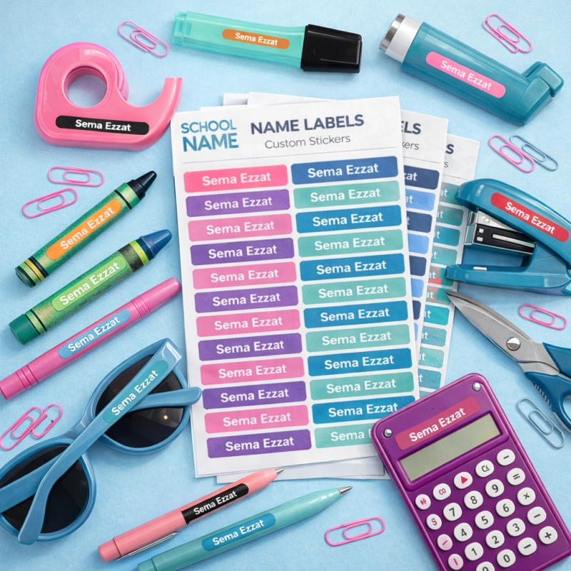 Waterproof name labels for bottles, books, stationery, and clothes.